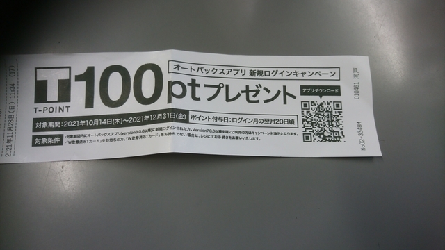 車体に小さな傷があったので、リペア剤を購入しに訪問。 会計後、レシートとは別にクーポン券をいただきました。 新規ログインすると、Tポイントを100ポイントもらえるようです。 さっそく登録し、ポイ活したいと思います。