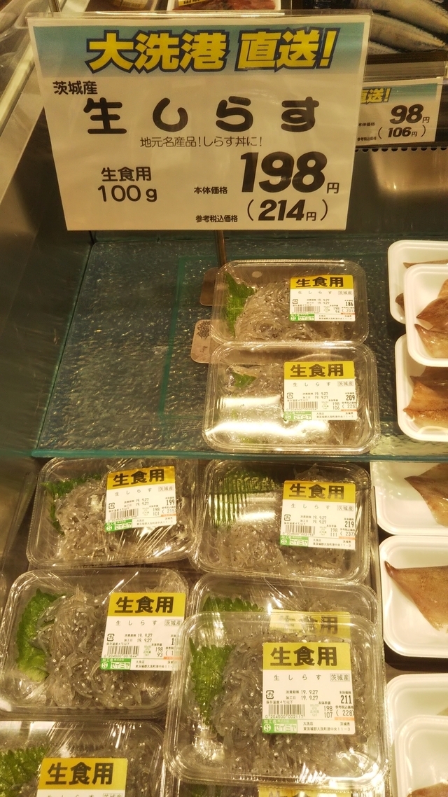 またしてもセイミヤに買い物に来ました。 今回は地元産の生シラスが売ってましたよ、ラッキー。 那珂湊の魚市場で釜揚げシラス買った後だったので帰って、シラス2色丼にしました。