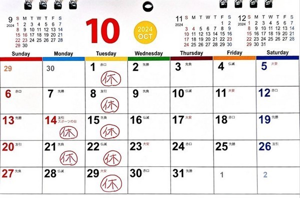 10月のお休みのお知らせです