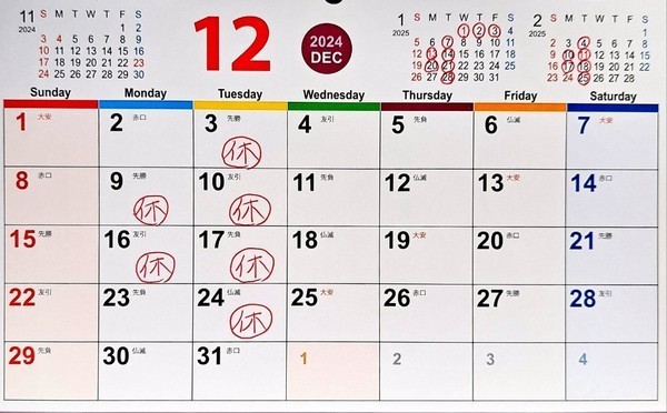 【12月の定休日】