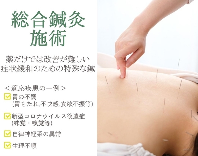 ◆初回 90分程度 ◆2回目以降 45~60分程度 薬だけでは改善が難しい症状緩和のための特殊な鍼で施術します。 肩こりや腰痛などの痛みの緩和だけでなく、自律神経・ホルモンバランスの乱れも改善していきます。 通院回数は症状の程度によってばらつきもありますが、慢性症状や・難病の症状改善であれば、1週間~10日に一回程度の間隔で 合計10回程度の施術を受けていただくことが理想です。 <適応疾患の一例> □胃の不調(胃もたれ、不快感、食欲不振等) □自律神経系の異常(自律神経失調症、起立性障害) □アトピー性皮膚炎 □生理不順 □顎関節症 □新型コロナウイルス後遺症(味覚・嗅覚等) □不定愁訴… 病院で検査をしても異常がないため、病名や疾病名はなく、診断がつかないもの。 つまり、原因がはっきりとわからないが、身体の調子が悪い、身体に不調がある状態。