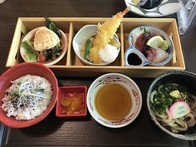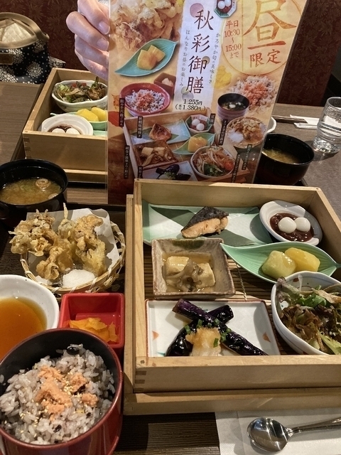 お風呂に入る前にお食事処を利用しました。ふくろう御膳をいただきました。お刺身や天ぷら、うどんなどもついていて大満足です。