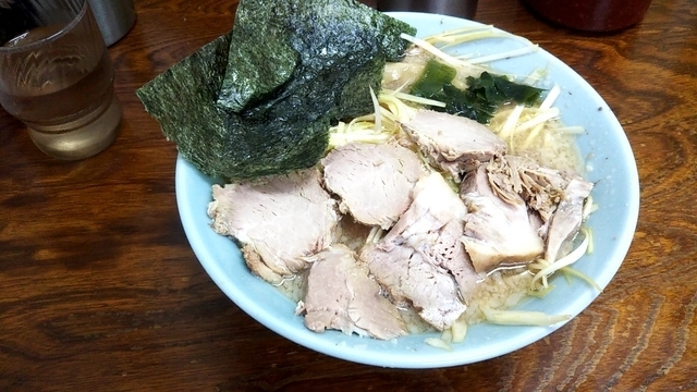 かなり久しぶりに平日夜に再訪すると、ほぼ満席の盛況さ。和風岩のりラーメンと餃子(6個)を注文しました。背脂の浮く醤油ベースのスープは魚介の香り・味わいが強くて美味しいですが、やや塩辛いかな。中細麺の上には岩海苔がどっさり載るだけでなく、板海苔2枚も添えられています。また6-7mm厚の豚叉焼2枚は柔らかで、他の具は刻み青ネギ、メンマにワカメ。餃子はやや小ぶりで、まあ普通の味わいでした。