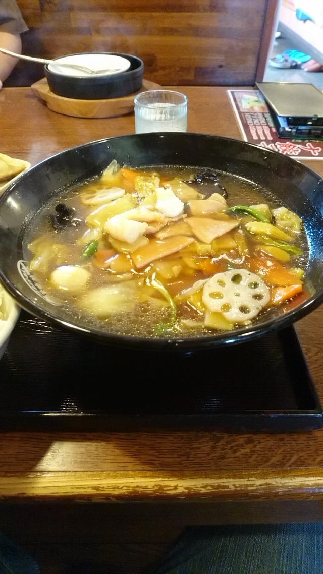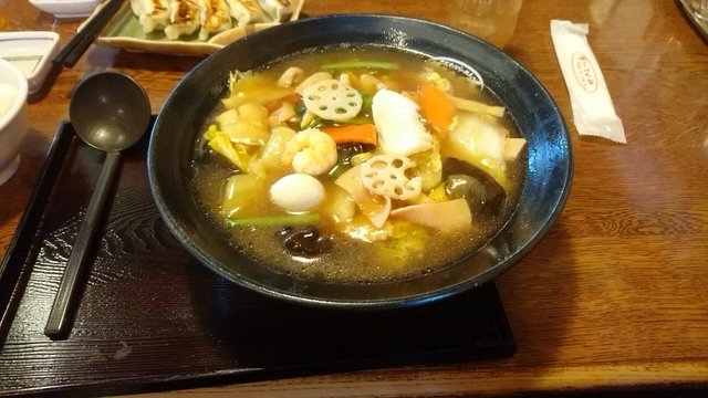 2019.5.15(水)12:40訪問。 七割くらいの入り、後客。 八宝うま煮らーめん850円+税。 具は、白菜、ニンジン、キクラゲ、レンコン、ヤングコーン、青菜、エビ、イカ、うずらの卵などたっぷり。 麺は細麺で、あんかけのスープがよく絡む。 スープはあっさり。 最後にスープにお酢を入れて、さらにあっさり。 ごちそうさまでした。