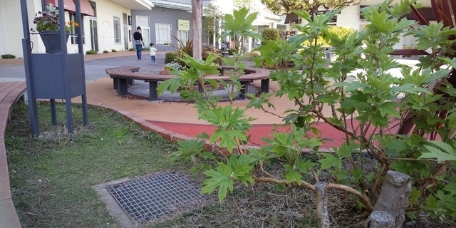 レストラン街の外にベンチやちょっとした植え込みがあります。休日でもこの場所は人が多くなかったので、座ってゆっくり過ごすことができました。
