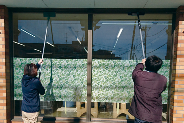 一般家庭・テナント様の窓ガラスなどに、障がいをお持ちの方がコーティングを行います。清掃労力の軽減・美観を保つためのコーティングです。