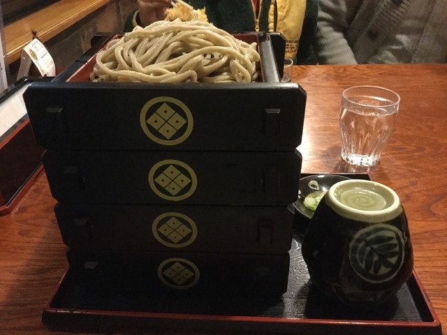 昼に久しぶりに立ち寄ると、ほぼ満員と相変わらず盛況。卓子席に着いて、つけとろろ(そば)を注文しました。やがて太く玄い田舎そばを載せた二段重せいろ(側面に「丸に隅立て四つ目」紋がある)が到来。切り海苔をかけたとろろ入りのそば猪口、ウズラ生卵と薬味ネギ・ワサビを載せた薬味皿、それにそばつゆ徳利が付いてきます。太いそばはコシがあり、特有の味わいがとても良いです。そばつゆはやはり辛めですが、とろろと太いそばによく合います。最後にそば湯で完食完飲となりました。