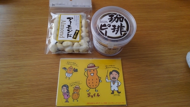 地元企業のイケノベグループの中で60年前から落花生や豆製品を栽培から製造販売までやっている会社です。加工工場の構内にあるこちらの直売所へ立ち寄ってみました。入口傍らには、はねだしものの殻付き落花生3kgを詰めた大袋が多く積まれて販売されており、いかにも工場の直売所らしいです。自社製品ばかりでなく他所の加工食品も扱っています。こちらの製品として「豆自慢(茨城県産大粒バターピーナッツ)」と「豆屋さんが作ったピーナッツペースト」を購入の他、他社品の「ピーナツみそしそ巻き」と「サラピーナ(ピーナッツを含む揚げ煎)」を買ってみました。閉店時間近くのためか1割値引きとなり、来年のカレンダーもいただきました。バタピーはビールの友として最適で、ピーナッツペーストは食パン用として普通に美味しいです。
