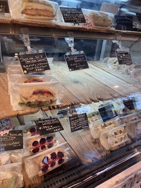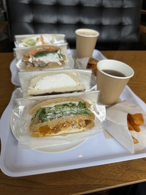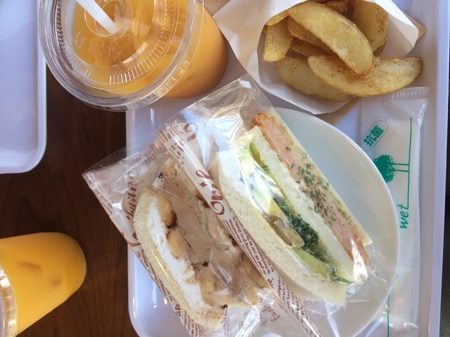 肉野菜系とスイーツ系のサンドウィッチが何種類もケースに並んでいて迷ってしまいます。 ランチセット、サンドウィッチ2つは多いかなと思いますがパンは以外と小さめなので大丈夫です!揚げたてのフライドポテトと飲み物が付いて¥950とお得です。イートインスペースが広々としていてゆっくり過ごせます。