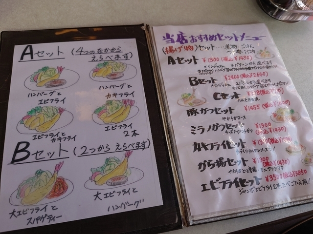 タウン誌で見付けて初訪問。 よく通っていた道なのに初めて知った^^; 行く前にメニューをネットで見ていて、Aセットがオススメみたいだった(Aセットには4種類ある。画像メニュー参照) エビが大好きだからエビは外せないな。オムライス美味そう!エビフライ単品があればオムライスにエビフライ付けて頼もう。と決めてました(笑) いざ注文。お店のお母さんに聞いたら単品はないみたい。お母さんオススメのハンバーグとエビフライのAセットを注文。 大きめのエビはプリプリ!ハンバーグは肉汁たっぷり!付け合せのきんぴらも美味かった! 満足満足♪ ここまでは満点だった… 後から来たお客様にお店の娘さんがAセットのメニューは単品出来ます。と…(T_T)えー…ショック… TVで紹介された(お母さんがお客様みんなに話してたw)ハンバーグとエビフライのセットをススメたいお母さんの気持ちはわかるけど、接客する人によってメニューが違うのは…うーん… メニュー表に書いといてほしいですね。 ま、単品あることわかったんでまたリベンジ行きますけどね!(笑)