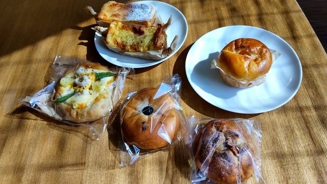 土曜昼に再訪。今回は比較的多くの種類のパンがありました。柔らかく薄黄色のひよこパンの他、くるみパン、ムラサキいもパン、雑穀の山型パンを食事パンとして購入。いずれも美味しくいただきました。