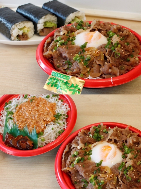 ・常陸牛丼 ・ピリ辛ひき肉のしらす丼 ・常陸牛ロール 旬の味覚を使用した おいしいお弁当を召し上がれ♪