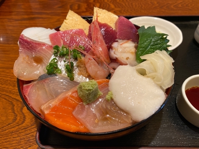 ランチで海鮮丼(大盛り)をいただきました。 色とりどりの新鮮なネタがたっぷり…味は勿論、目でも楽しめる逸品です。 付け合わせの茶碗蒸しも出汁が効いてとても美味しくいただきました。