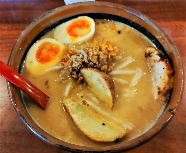 《北海道味噌らーめん(836円)+味噌漬け炙りチャーシュー(154円)+煮玉子(137円)》 イチオシのメニューは『北海道味噌 味噌漬け炙りチャーシュー麺』で、分厚いチャーシューが 3枚もあります。3枚は多いかなと思ったので、シンプルな味噌らーめんに、チャーシューを1枚、 煮玉子をトッピングしていただきました。 麺は中太麺で、味噌スープはおいしく、チャーシューもホロホロといった感じで柔らかく、おいしく いただきました。 支払いは現金のみでした。
