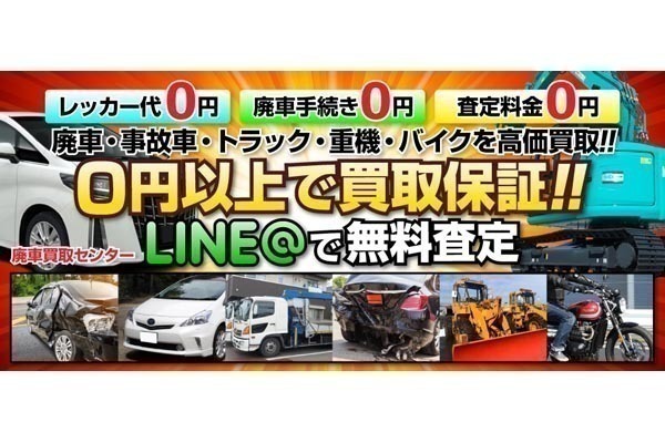 弊社では、もう一つの事業で廃車の買取を行っております。【廃車買取センター】では、事故車/不動車/車検切れ/不要車/過走行車/水没車/などの価格が無いと思われているお車でも0円以上で買取ります。また無料査定&無料手続き代行致します。
