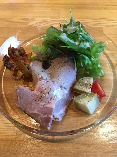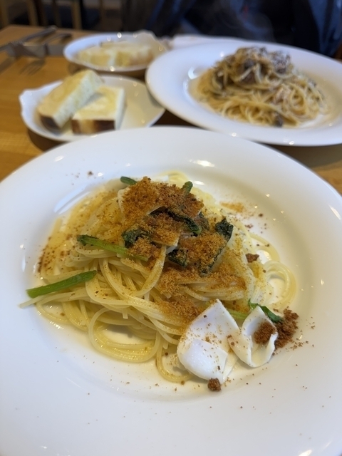 日曜昼に連れと初訪問。前客3組で卓子席へ着き、ランチパスタセット(前菜・自家製フォカッチャ・ドリンク)を4種のメインから選びます。私は「しらすと生のり・白菜のクリームソースパスタ」、連れは「若鶏のスモークとズッキーニ・長ネギのカチョ・エ・ぺぺ」で、ドリンクとしてホットコーヒー、さらにCoutaクーポンでプチドルチェを注文しました。初めに到来した前菜3種はナスのカポナータ(トマト煮)、ローストポーク+ニンジンマリネ、サツマイモ+プチトマト、さらに水菜とベビーリーフのサラダが添えられています。次いで到来した自家製フォカッチャはトーストされて温かく、オリーブオイルが垂らしてあります。もっちりして美味しい。メインのパスタももちもちの食感の太麺で浅草開花楼の特注麺(パスタフレスカ)とか。これにややこってりしたホワイトクリームソースがよく絡んでおり、かなり美味しい。具はしらすと生のりは確認しましたが、白菜は入っておらず、代わりに春菊が。まあ美味しいので良いですが。連れのカチョ・エ・ぺぺはチーズと黒胡椒によるシンプルな味付けで美味しいとか。具はスモークチキンスライスとズッキーニに長ネギ。食後はプチドルチェとしてイチジクと小さなクリームケーキスライスのキャラメルソースがけ。ホットコーヒーとともに味わいつつ寛ぎました。