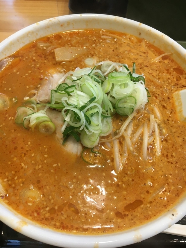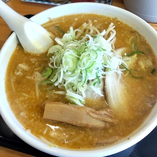 ●みそ 鶏豚骨ベースに濃厚ピリ辛スープ。 麺は細麺のやわらかめ。 トッピングには、刻みネギ、もやし 極太メンマ、チャーシューなど。 ピリ辛なので食がすすみすぐ完食。