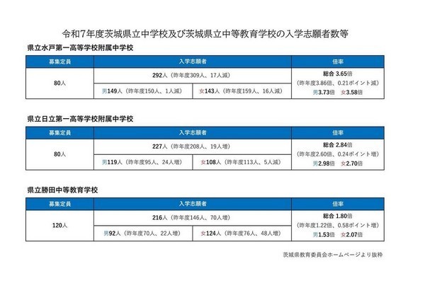 令和7年度茨城県立中学校及び茨城県立中等教育学校の入学志願者数等が発表されました。