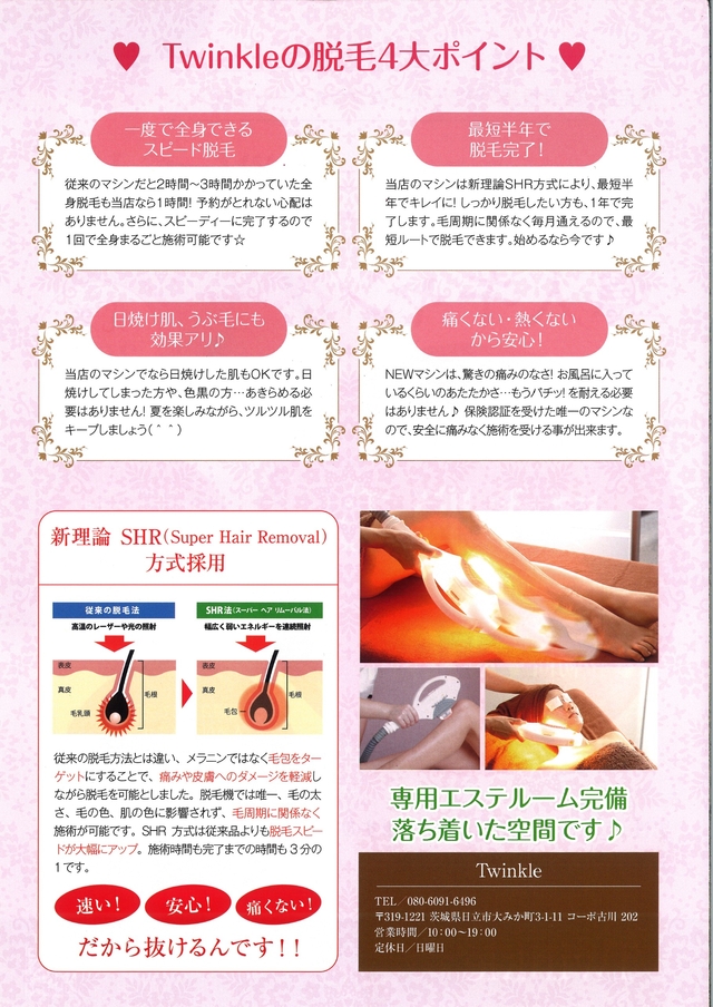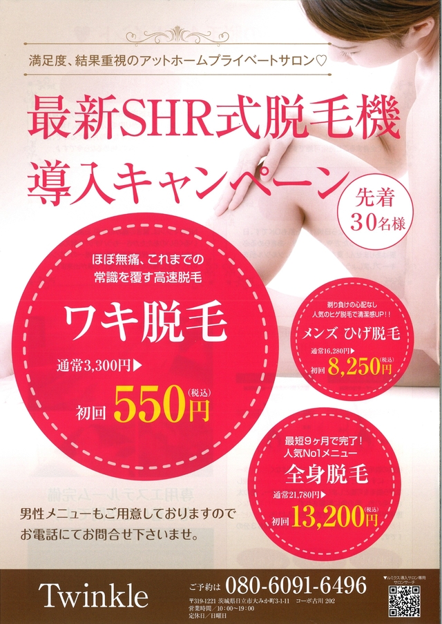 ★最新SHR式脱毛機導入キャンペーン ★ 先着30名様! ■ほぼ無痛、これまでの常識を覆す高速脱毛!剃り負けの心配なし♪ 【ワキ脱毛】通常3,300円→初回550円 (税込) ■人気のヒゲ脱毛 通常16,280円→初回8,250円 (税込) ■最短9ヶ月で完了!人気No1メニュー☆ 【全身脱毛】通常21,780円→初回13,200円 (税込) 男性メニューもご用意しておりますので お電話にてお問合せ下さいませ♪