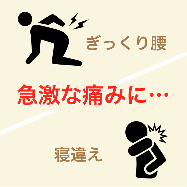 ぎっくり腰(腰・背中・お尻の痛み、動作時の痛み、安静時の痛み、歩行困難、起床時の痛み etc...)