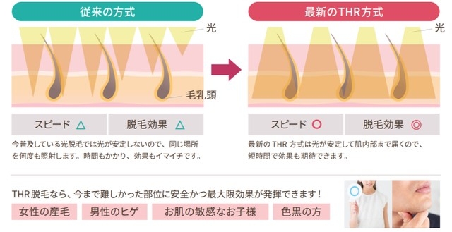 THR方式はレーザー脱毛とは違う波長のためメラニン色素ではなく毛を作る幹細胞が存在するバルジ領域に直接作用!美肌効果があり、肌へのダメージや痛みも少ない最先端の脱毛機器です。 最新のTHR方式は光が安定して肌内部まで届くので、短時間で効果も期待できます! また、ヒゲや色黒の方にも安全かつ最大限の効果を発揮!