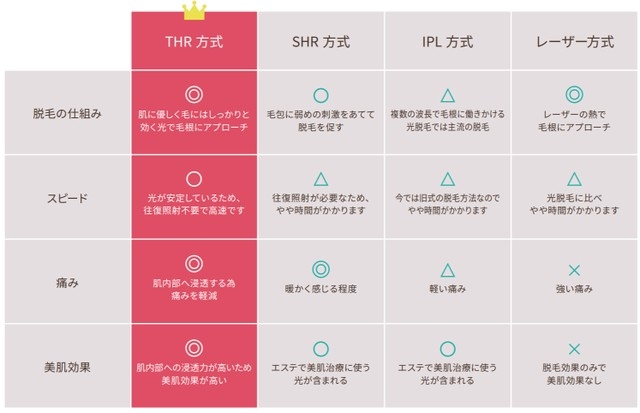 表をご覧いただいてもわかる通り、THR方式は従来に比べてスピーディーで良質な脱毛効果を期待できます。