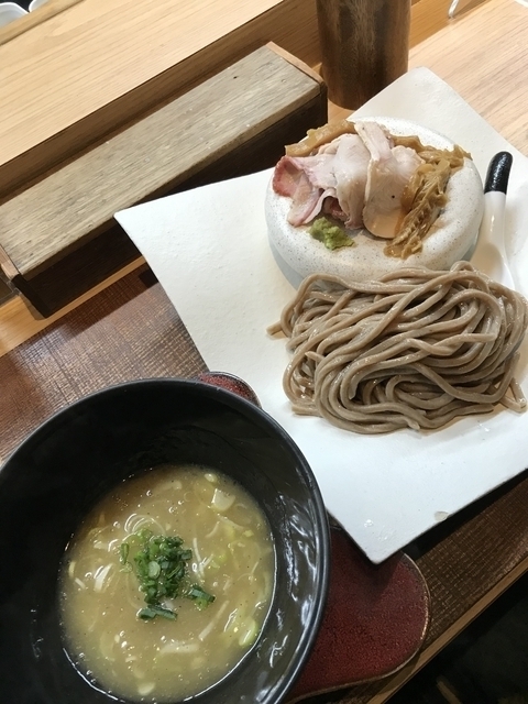 2021.7.25(日)13:50訪問。 先客外待ち1名だったが、すぐ中に通される。 店内はおしゃれなバーのような雰囲気。 ご飯が切れちゃったそうなので、食券機で濃香つけ蕎麦(中)300gをポチりし、店員さんに渡し待つ。 その後2~3分後席に通され、5~6分後、着丼。 すべてがおしゃれ。 まずはつけ汁。 クリーミーながらあっさり。 麺は日本蕎麦のようなビジュアル。 コシがあり、旨い。 具は、ローストチャーシューとササミのチャーシュー、メンマ、ワサビ、柚子胡椒。 ワサビと柚子胡椒を使うとさらにあっさりとなり、最後に残ったつけ汁を割りスープでいただくと、これまたいい。 つけ麺を食べたというより、何か新しいものを食べた感じでした。 ごちそうさまでした。