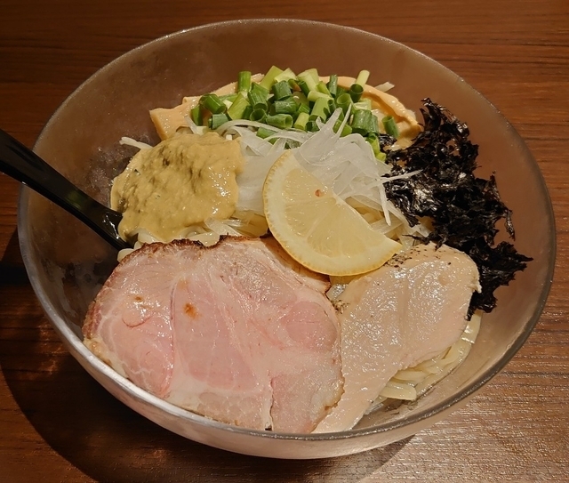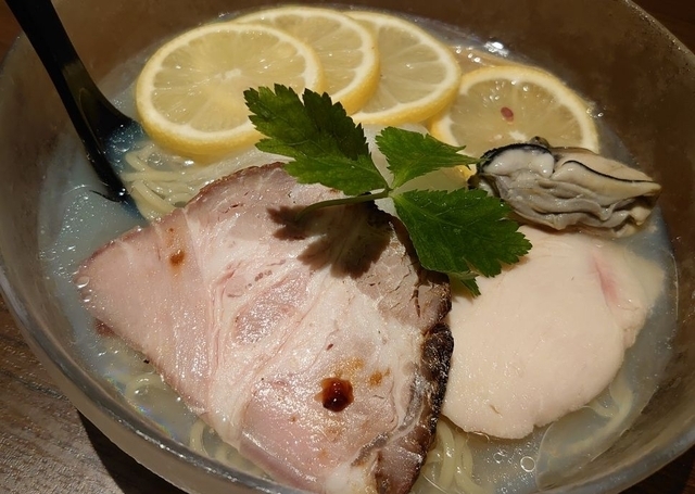 限定の牡蠣檸檬冷やし。 冷たい牡蠣の味がするスープに締まった細麺がおいしい。 2種類のチャーシューもおいしい。牡蠣もいいなあ。 レモンを絞るとさっぱりと食べられます。