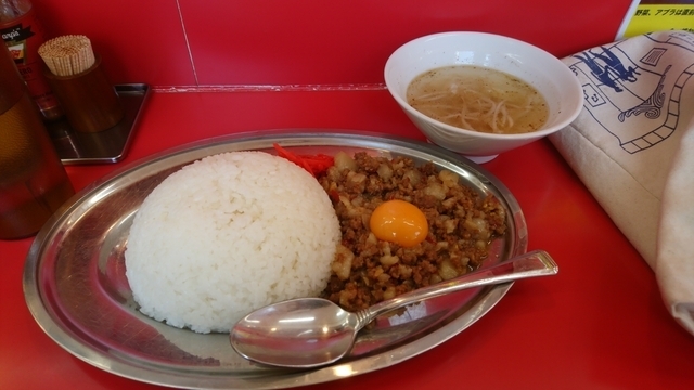 2020.11.17(火)13:00訪問。 先客なし、後客一組。 本日のランチは、古河市内国道125号線沿いにあるこちらで。 マシライスが旨いという話を聞いていたので、食券機でマシライスをポチ。 食券を店員さんに渡したところ、ご飯の量が350g~700gまで選べるということで、400gに。 カウンターで待つこと5分、着丼。 カレーライスを食べるときのような銀皿。 丸く盛られた白米の脇に、挽き肉とアブラ、唐辛子を炒めたものが。 こちら、甘いじょっぱく濃いめの味付けで、ほんの少し辛味を感じる。 これはご飯がすすむ。 お肉にのっている生たまごを混ぜると、マイルドな味わいになります。 付け合わせのスープは、モヤシとキャベツが具の塩分控えめコショウ多めのスープ。 お肉の味が濃いめなので、いいバランスです。 あっという間に完食。 もう少しご飯多めでもいけちゃいそうです。 ごちそうさまでした。