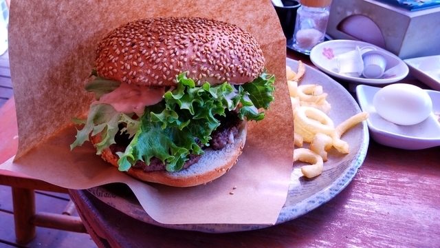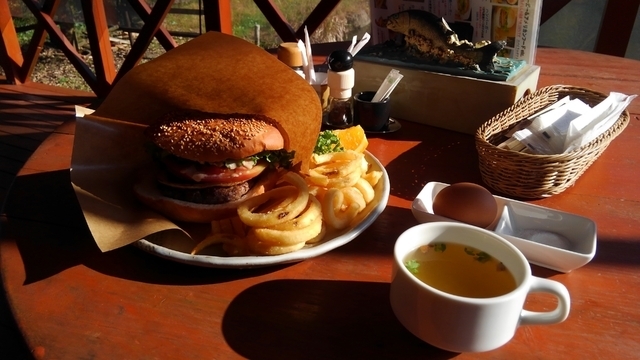 休日に釣りで再訪ですが、行く前から今回はハンバーガーを食べると決めていました。 12時過ぎにカフェに行くと一杯で入れず。暫く釣りをしてまた行きましたが、またも一杯で結局13時半過ぎに入れました。釣りでなく食事の方もかなり多いようです。 初めて、こちらのハンバーガーを食べましたが、かなり大きくハンバーグもしっかり肉の味がしていて、トマトとタマネギも入って、おいしいです。ポテトもタップリ、スープとゆで卵もついて、なかなかの満足感で、食事目的に来られるのも納得です。 ちなみに、釣りも簡単ではないですが、50cmも釣れて、とても良い1日になりました。