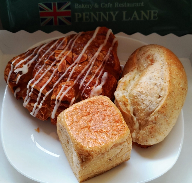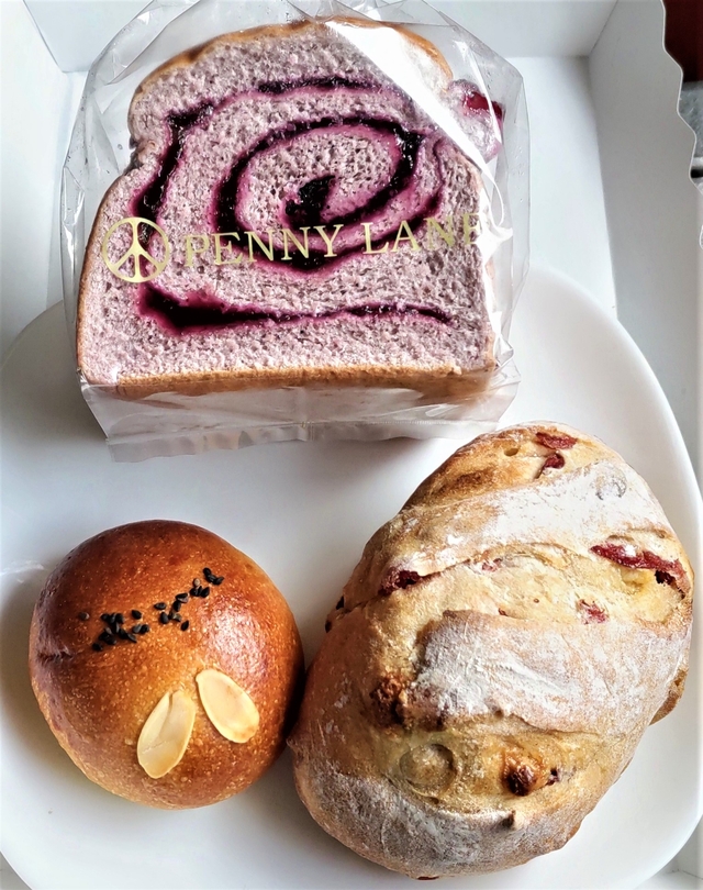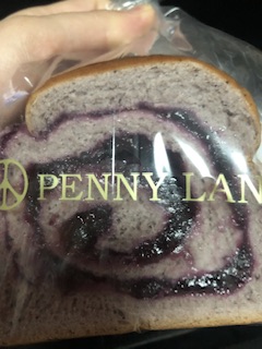 ペニーレインを代表する『ブルーベリーブレッド』は購入必須ですが、その他に店舗限定のパンが何種類かあり、その中で、『クランベリーとホワイトチョコ』『リンゴとさつまいものあんぱん』を購入しました。 クランベリーとホワイトチョコは、ライ麦を使った生地の味とクランベリーの甘酸っぱさがおいしかったです。 リンゴとさつまいものあんぱんは、小さいですが、さつまの餡が結構甘いのでちょうどいい大きさです。餡の中に小さくカットされたリンゴが入っていましたが、もう少し入っているといいかなと思いました。 ブルーベリーブレッド(ハーフ)460円、 クランベリーとホワイトチョコ300円、 リンゴとさつまいものあんぱん 170円。