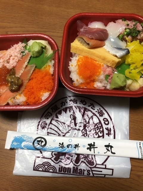日曜の昼食としてテイクアウトするために、再び電話を入れて「海鮮丼(大盛)」と「うおがし丼(並盛)」を予約注文しました。現在は10分程度でできるとのこと。サービスクーポンによる即席吸物とともに受け取りました。海鮮丼は大盛なので容器が少し大きく、具の種類は多彩(マグロ赤身2/イカ2/サーモン2/コハダ/イクラ/小エビ/ホタテ/ガリ)。うおがし丼も具は多彩(ネギトロ/マグロ赤身2/イカ3/ウニ/イクラ/ガリ)で、税別ワンコインではコスパが良いかと。吸物(ワカメ/麩)は即席だけにまあ普通です。