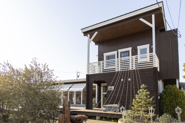 住宅街の中にひっそりと佇む、緑に囲まれたログハウスが目印です。