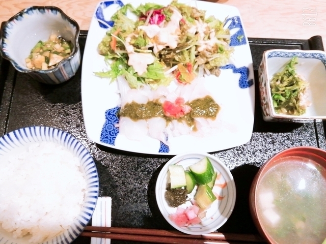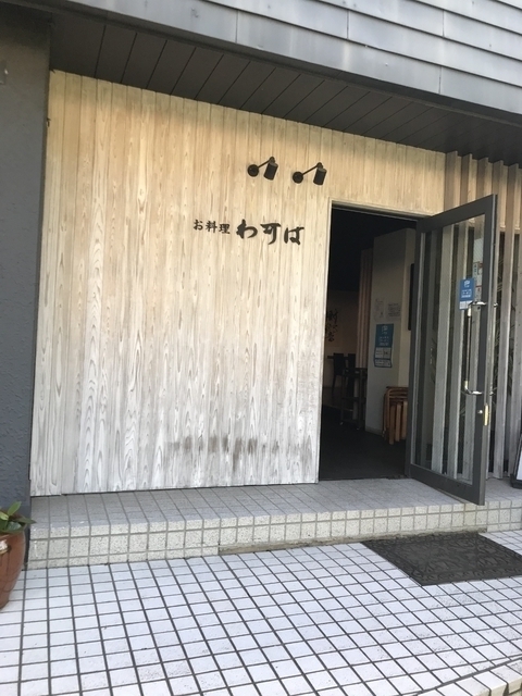 本店が福島いわき湯本温泉の割烹旅館「わ可ば」という和食処で、ロードサイドにありながら目立ちにくい、ちょっと隠れ家的な感じのお店です。数年前にも歓送迎会で半個室のような卓子席を利用しましたが、落ち着いた雰囲気が良いです。平日昼に訪れると、玄関で検温・消毒の他、店内のCO2濃度が常時計測され、定期的に換気を実施するよう対策されています。厨房を囲むようなカウンターに案内されると、アクリル板が林立する中、先客2人・後客6人でほぼ席が埋まりました。着席で渡された日付入りの奉書紙にかかれたメニュー紙というのも高級な感じです。日替りランチの「さばソテーのトマトソース」を注文。平膳の主皿には、トマトソース(刻みトマト・タマネギ入り)をかけた、塩ソテーされたサバ半身とたっぷりのサラダ(サニーレタス/水菜/キュウリ/ニンジン/パプリカ/コーン/香草/カイワレにバジルソースドレがけ)が盛られ、小鉢2品としてはポテトサラダ(ポテト/紫イモ/キュウリ)とシシトウの炒め物。これにお替り可能なご飯(小茶碗)と味噌汁(豆腐/シメジ/青菜)、漬物(キュウリ浅漬/キュウリ・シソ柴漬)が付いてます。ご飯お替りと食後のデザートとして出された水ようかんで満腹・満足しました(なお会計はレジコーナーがないので、カウンタで行う形でした)。