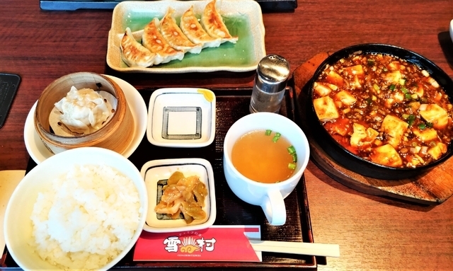 《麻婆セット》990円 サービスセットで、一品料理にごはん、スープ、大きめの焼売、ザーサイがセットになっています。 一品料理は5品の中から選べます。その料理によって価格が変わります。 麻婆豆腐はグツグツ熱々でサーブされます。そのままでもおいしいですが、花椒(ホアジャオ)の粉末をかけていただくとよりおいしくなります。 ゆきむら餃子は275円。ジューシーでおいしいです。