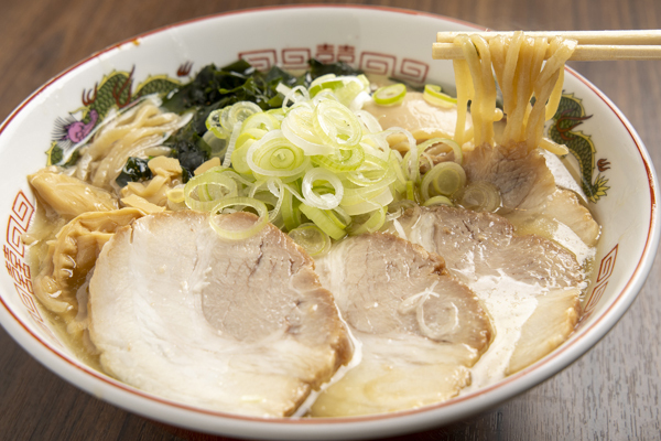 同じとんこつスープを食べ応え充分な極太麺スタイルに仕上げた親だるま。溢れ出す鶏油の香りと太麺が絶品!