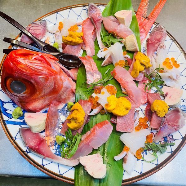 お刺身、焼き魚、煮付け、お寿司と日本酒をお楽しみください