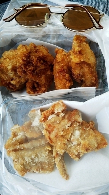 醤油唐揚げ4個と塩唐揚げ2個を持ち帰りしました♪ 醤油も塩もどちらも大きい(^^)比較対象にサングラスおいてみました。 旨味の効いた醤油唐揚げと胡椒をふりかけた塩唐揚げ。 どちらも美味しく頂きました♪ また買いに来ます