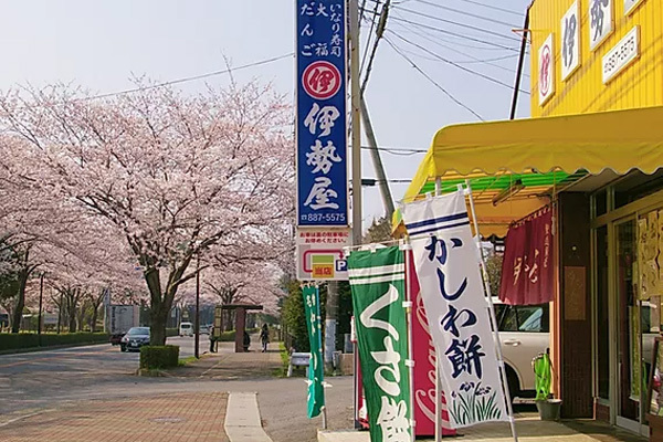 店頭に並んだ品物はすべて手作り。店の奥に見える工房で、毎朝早くから作っています。石臼でつくだんごは程よい弾力が魅力。季節限定の桜餅・草餅・柏餅も人気です。
