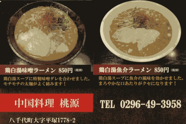 赤坂榮林で修行したのち、茨城県結城郡八千代町で平塚で桃源として平成2年にお店をオープンしました。スーラータンメン、浅草開化楼の麺を使ったつけ麺を筆頭とした美味しい料理を提供いたします。500円ランチも提供中で、そのうちの一つ 半チャーハンラーメン定食は ラーメンとチャーハンそして大きい焼売が2個、サラダ、コーヒーがついています。低価格で旨いコスパ良!を茨城県民や近隣の県の方に一度体験して頂きたいので、ぜひご来店ください。
