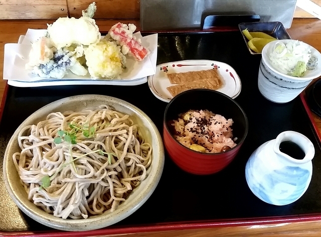 ◆田楽そばセット1,100円 常陸秋そばと、季節の天ぷら ごはんのセット。 そばは細麺のやわらかめで、 安定の美味しさ。 揚たて天ぷらは野菜が、 種類豊富並びます。