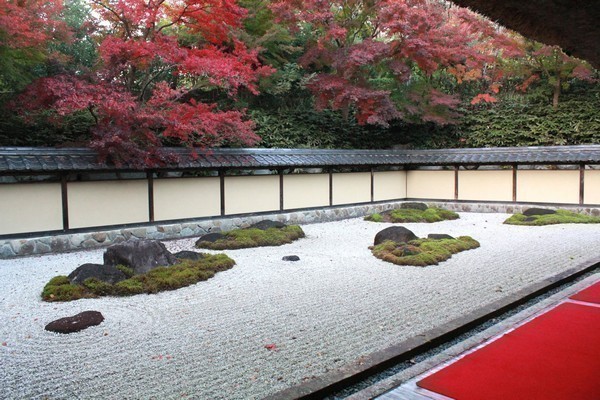 京都・龍安寺を模してつくられた枯山水による石庭。魯山人が設計した茶室「夢境庵」も見どころの一つ。