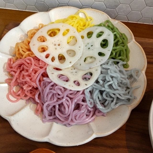 ●六色麺つけ800円 見た目がきれいな自家製の野菜の麺。 カボチャ、トマト、ビーツ、ムラサキイモ、バタフライピー、ホウレンソウの六種類。 麺は細麺のやわらかめ。蕎麦に近い食感。 トッピングにレンコン。つけ汁は濃厚魚介系。とろとろチャーシューが三枚。