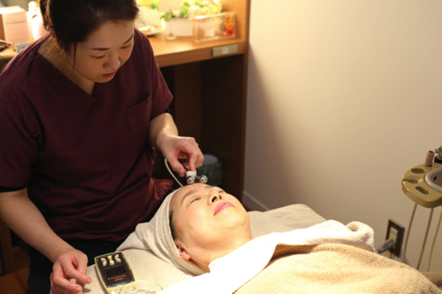 電気の力で表情筋をほぐして引き上げます。 ※70分コース・110分コースのみ。