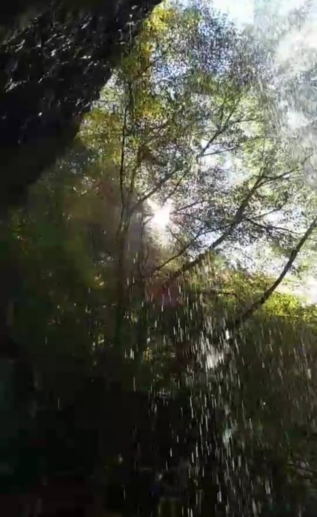 滝の裏にまわることができるスポットです。小雨のように散ってくる水しぶきが気持ちいいです。下から見上げると木漏れ日がとてもきれいです。