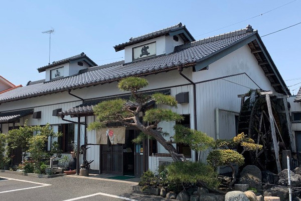 店舗の右手、道路沿いに直径4mほどの立派な水車を併設。店内に入るやいなや、水車挽きのガタンゴトンという音が響いてきます。