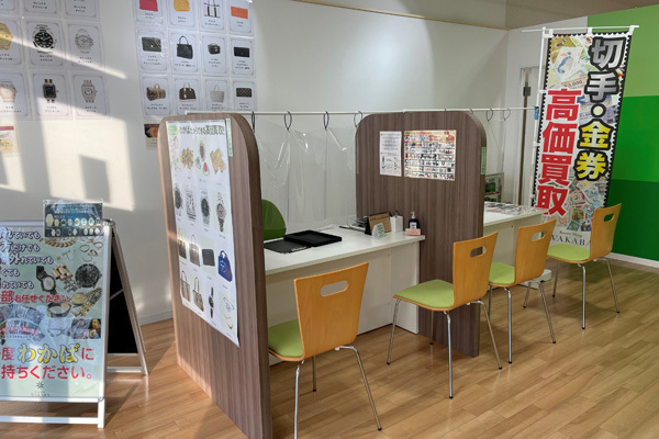 国内外で高く売れるルートを持っているからWAKABAは圧倒的に高価買取!知識豊富な鑑定士が真心査定と丁寧な接客でお迎えいたします。店内はゆったりとしたスペースで、査定時も、お隣のお客さんのが見えないようにパーティーションで仕切られているのが特徴です。安心してお越しください。
