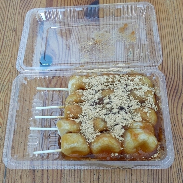 バイク仲間と昼食後の散歩中お店の前を通りがかり別腹と言うことでミツダンゴをいただきました。お店の脇にベンチがありそこでまっつたり、きなこがたくさんかかっていて甘すぎないので私好みですね。安くておいしいおだんごでした。
