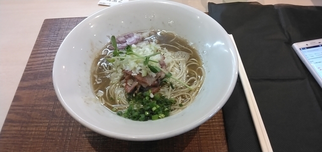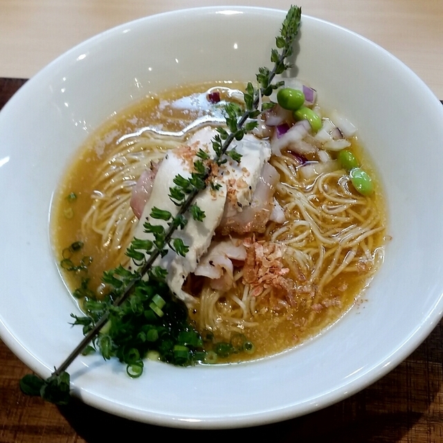 ●鮮魚と水790円 煮干し油使用。スープはあっさりしているが、旨味か溢れている。 麺は極細麺のやわらかめ。チャーシューと合わせて食べると良い。