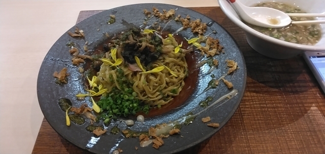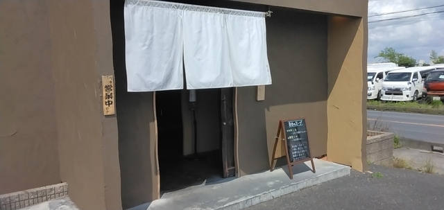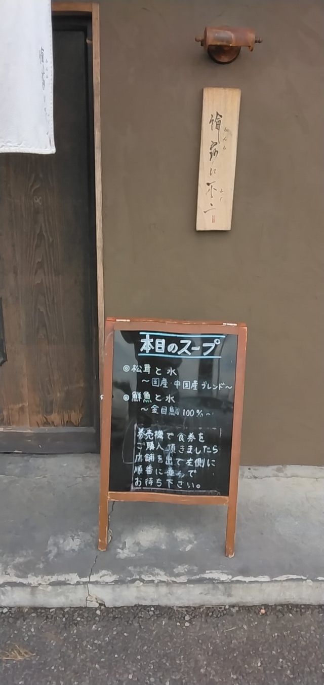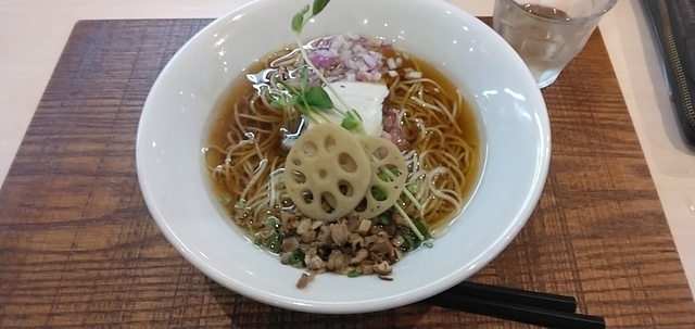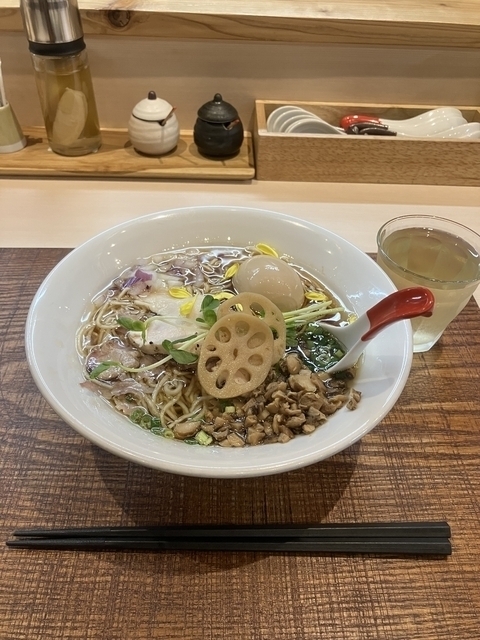 2022.6.9(木)13.55訪問。 先客四組、後客二組。 本日のランチは、坂東市内芽吹橋付近。前から気になっていたお店です。 食券制で、「松茸と水」というメニューをポチリ。店員さんにカウンターに通される。 店内はゆるめのジャズが流れ、おしゃれです。 水も四種類くらいあって、水も旨い。 厨房内の店員さんとお話ししながら待つこと約5分、着丼。 今流行りの円錐形のような丼。まずはスープ。 醤油や塩分強めながら、旨い。麺は中細麺。全粒粉ってやつでしょうか。 具はチャーシュー、レンコン、刻み松茸、刻みタマネギ。 このチャーシュー、二種類で、どちらも脂身少なめながら燻製されているのか香りが良く、味もしっかり付いていて旨い。 これでご飯が食べたい。あっという間に完食。 ごちそうさまでした。